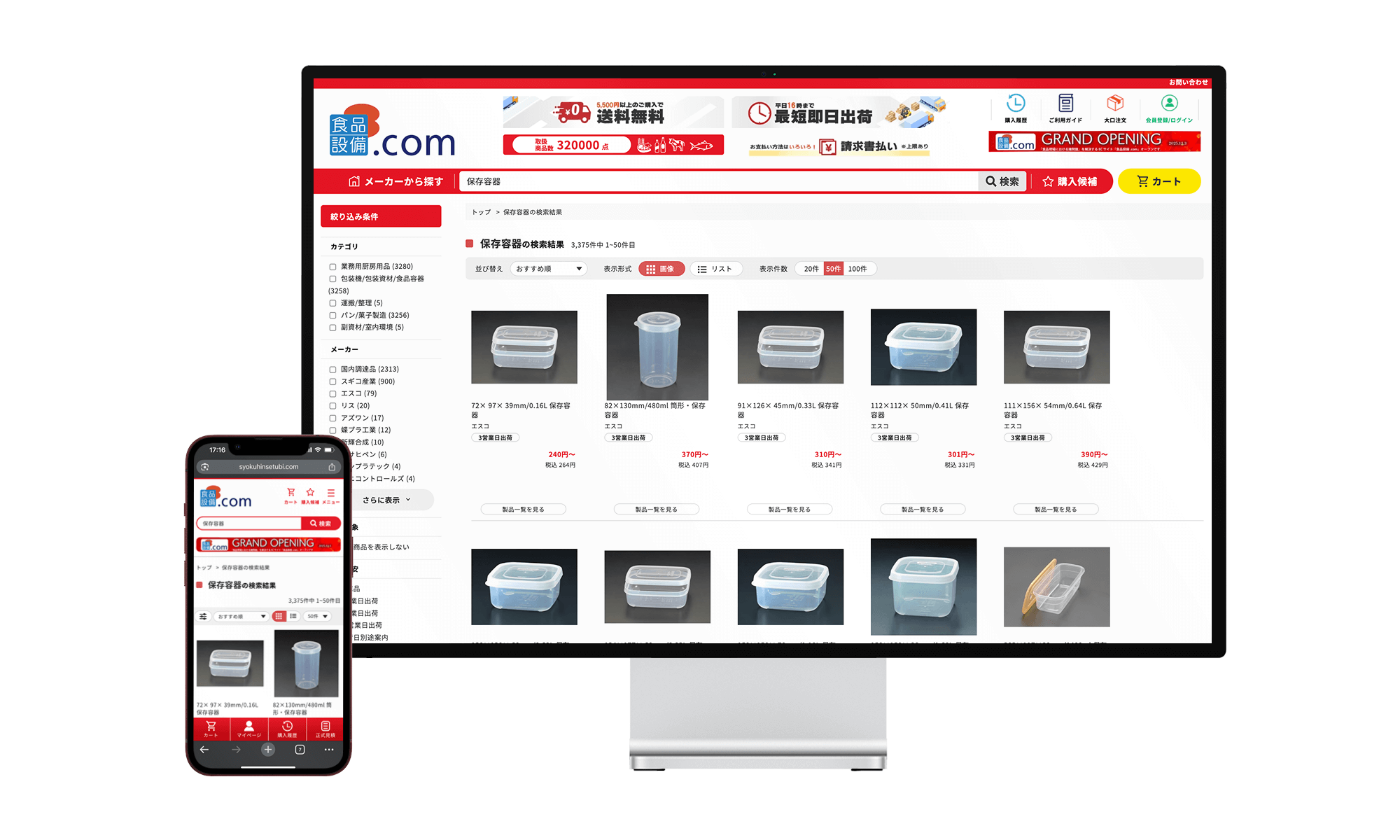 『食品設備.com』は、食品の製造・加工・貯蔵に不可欠な機械や器具を30万点以上取り扱う専門サイトです。国内外60万点以上の資材を扱う同社の強みを活かし、個別販売から工場単位の大量ロット注文まで幅広く対応しています。