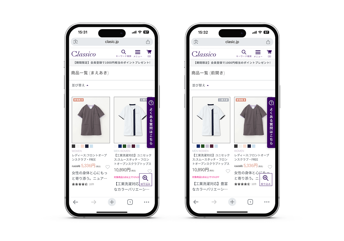 アパレル特有の「色」「サイズ」に加え、メディカルアパレル特有の「制菌加工」「静電防止」「軽量素材」など、細かな条件による絞り込みを瞬時に実行。忙しい医療従事者が、限られた時間の中で理想の商品に辿り着ける環境を提供します。