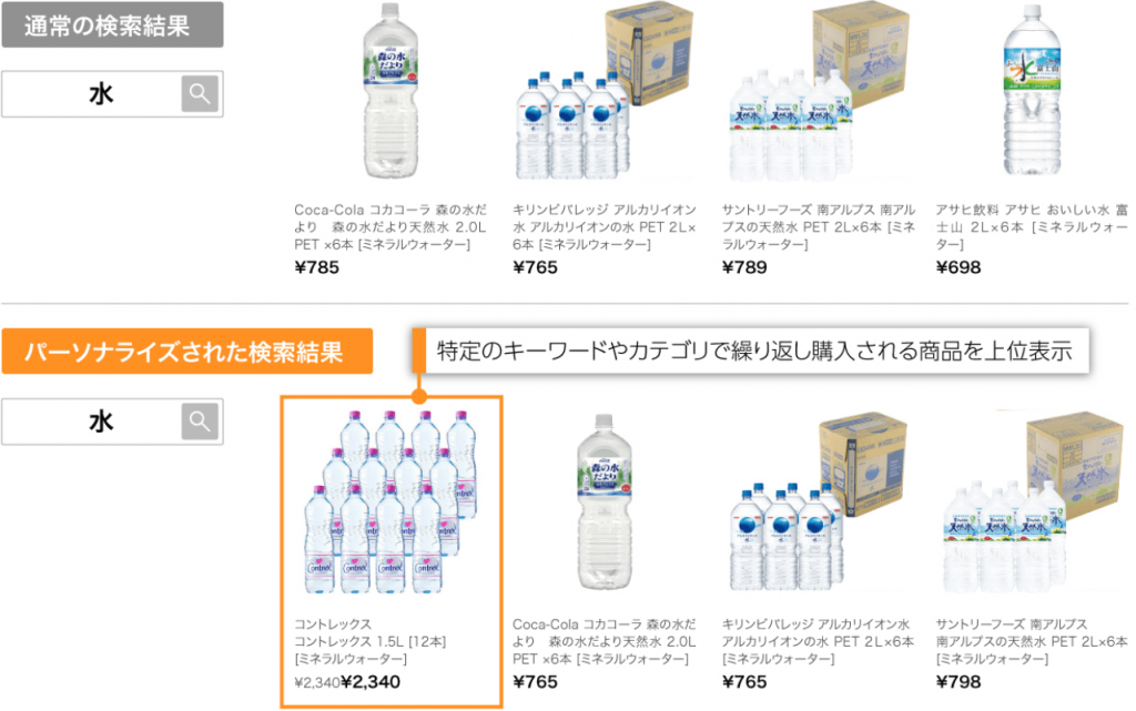 たとえば、日用品のサイトで以前から特定の銘柄の水を購入しているユーザーには、サイト全体で売れ筋の水ではなく、よく購入している銘柄の水を上位に表示します。
