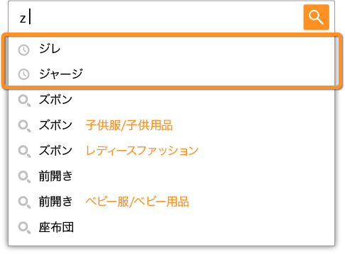「z」1文字の入力で過去検索したことのある「ジレ」「ジャージ」等のワードを自然に上位に提示しています。
