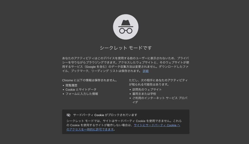 シークレットモードの使い方は、使用しているデバイスやブラウザによって異なります。たとえば、Macの場合は「command +Shift +N」をクリックすると、以下の画面が表示されます。